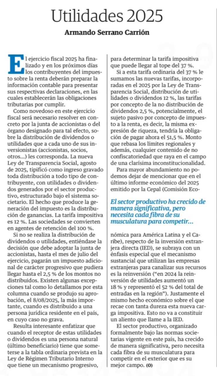 Como novedoso en este ejercicio fiscal será necesario resolver en concreto por la junta de accionistas o del órgano designado para tal efecto, sobre la distribución de dividendos o utilidades que a cada uno de sus inversionistas (accionistas, socios, otros…) les corresponda. La nueva Ley de Transparencia Social, agosto de 2025, tipificó como ingreso gravado toda distribución a todo tipo de contribuyente, con utilidades o dividendos generados por el sector productivo, estructurado bajo el sistema societario. El hecho que produce la generación del impuesto es la distribución de ganancias. La tarifa impositiva es 12 %. Las sociedades se convierten en agentes de retención del 100 %.